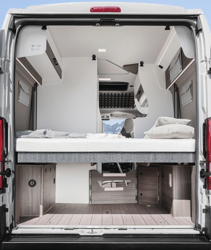 Während klassische Hubbetten, die man aus deutlich teureren Reisemobilen kennt, komplett unter der Decke verschwinden und damit nicht mehr zum Schlafen nutzbar sind, ist der Schlafbereich im VANTourer Kastenwagen je nach Position voll benutzbar. Darunter sind die wertvollen Urlaubsutensilien sicher und sauber verstaut. So lässt es sich ruhig schlafen. Dank der serienmäßigen Vorbereitung kann das praktische Hubbett auch jederzeit nachgerüstet werden.